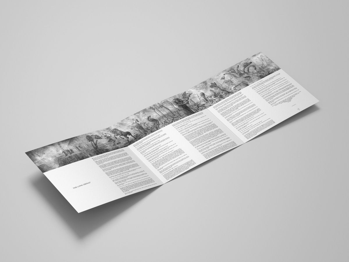 “The Long Defeat” unfolds over three parallel storylines told via three different mediums. Two in writing: the lyrics, as well as a fable. The third speaks through the artwork – two metres’ worth of maniacally detailed visions depicting the same premise its written content draws from. All three are fundamentally entwined but diverging in narrative, each complementing or contradicting the others.